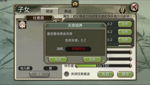子女的特點可對爸爸媽媽當中撫育此子女的壹方發生战力加成,加成數值是當時特點x其對應的天分值。天分可以運用天分丹培育。天分區間為0.2-1,分為白、綠、藍、紫、橙五種品階。
