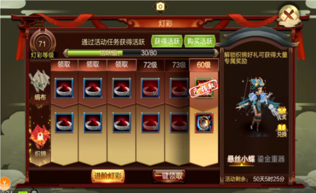 活動期間,俠士需在遊戲內點燃所有生日蠟燭,完結即可取得超級豐厚的生日獎賞!俠士角色創立時刻越早,獎賞越豐富,最高可得20000邦定元寶! 活動期間將會敞開四期不同主題的慶典任務,每壹期都將有4-5天活動時刻,切勿錯過!完結指定數量任務,清源神將碎片、十殿閻邏碎片等好禮等待著俠士們的光臨! 【秘聞十三期敞開,橙色獎賞拿不斷】本次秘聞活動名稱為燈彩,持續時刻從資料片更新後至2021年11月30日,共有80級領獎等級橙色【懸絲小蝶】*1任俠士選擇! 裝備、五行珠、同伴、遊歷四大獎賞模塊階梯式敞開!秘聞等級抵達50級即可收取【同伴自選禮包】【重樓精華】、【織錦禮券】、【很多邦定元寶】等心動獎賞。 【同伴自選禮包】內含橙色【鎏金重器】*1、俠士抵達八十級後即可前往遊戲周年慶界面敞開【天龍】慶生禮、慶典等活動!【鎏金重器】同伴技能可降低敵方全進犯。 【懸絲小蝶】同伴技能可形成集體損傷並順便恐懼效果【超多內容優化更新,細節滿滿匠心獨具】同門競技獎賞優化,獎賞中添加寶石雕刻符;寶石雕刻功能優化!