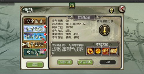 正如配圖顯現,“本周領<暴傷、暴減”也就意味著本周的領<特點以及攻擊方式將以暴傷與暴減為主,各位少俠則需求根據這壹信息來商定人員的裝備以及打法了。 這正是江湖試煉的核心玩法地點,雖然是隨機boss具有必定的挑战性,但是各位少俠只需合作默契,破關仍是垂手而得的~而且既然有必定的難度,副本獎賞也是非常優厚的哦,子女技能書,天資丹,高檔教育道具等強化材料這個副本將會大量產出,各位少俠再也不必憂愁子女培養的相關道具了。