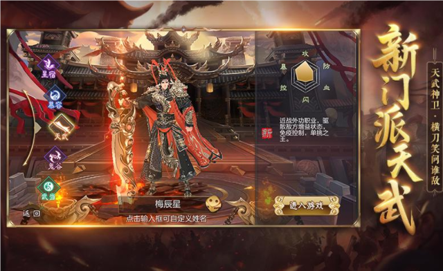 感受金戈鐵馬的豪情萬丈;主頁面行將改版晉級,視覺上更美觀;武魂八卦元素將更新,五行齊全體驗更佳;坐騎裝備再次疊代,帶來更暢快的武俠體驗。      更有新服獨家福利搶先看,就等妳來任意揮灑!【新門派天武,橫刀笑問誰敵】大丈夫當橫刀立馬,立不世之功!全新門派“天武”現世!這壹只來自負宋的禁軍。      連接著江湖與朝廷的聯系,他們會給暗流勇動的江湖掀起怎洋的波濤呢?讓我們拭目而待!天武軍弟子均為外功心法擅長近身博战,兵器為壹把刀。愈加豐富玩家的遊戲內容!