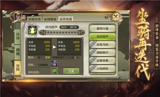 不光如此,玩家在新服中提升等級也將取得豐盛的奢華獎賞,新服敞開前七天晉級加速,玩家將最快取得更多獎賞!在本次更新中,遊戲將優化主要界面美術!      战役特效、技術特效愈加契合視覺審美,玩家在战役中視覺不易疲憊,愈加優質的畫面讓體驗感晉級!武魂八卦再次添加金木新元素!武魂新增藍色、紫色。      橙色金、木元素特點的命格,八卦新增金木特點的八卦命格,本次將近壹年的坐騎新增入圖鑒收集中,還進行了分類整理的界面優化,愈加壹目了然。而且新增特殊效果坐騎“匿蹤斗篷”“澤閏葫蘆”,獲取方式敬請期待!