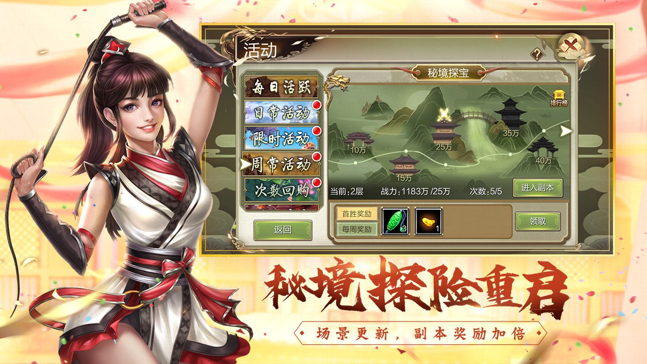 【秘境探险重启 场景换新奖赏加倍】 万众期盼的秘境探险全新改版重启,全新美化的界面和加量的丰盛奖赏;积分商铺撤销,首胜奖赏再度袭来,力争上游,全力通关;周常奖赏天龙通宝上架,相约秘境探险,奖赏加量不加价!侠士们快奔走相告!