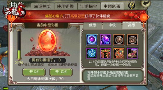 玩家砸取20次初級彩蛋可以晉級中級彩蛋,道具獎賞也煥新晉級,砸取50次中級彩蛋後可開啟高檔彩蛋,高檔彩蛋有機會墜落紫色精魄,質量遠高於迎春圖贈送的綠色彩蛋,這波不虧! 高檔彩蛋除了能贏取紫色精魄和慣例強化獎賞外還能獲取資質95的橙色同伴祥瑞醒獅。大初八沒能上線導致錯過了迎春圖的少俠就可以經過本次活動獲取,橙色同伴輕鬆擁有,不用擔心落於人後!