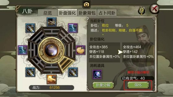 除了花費元寶占蔔,現在還能夠經過主題月活動積分換購【占蔔銅錢】和【天降雨澤禮盒】獲取卦象,分化強化的好機會千萬別錯過了!需求耗費同名、同卦位強化0卦象。 與卦位強化不同,每個卦象最高能強化到9級,卦位強化是永久的,不管妳怎麼替換卦位上面的卦象,卦位的特點加成都是不會變的,能夠說是很劃算了!71萬卦盤,妳也能夠擁有。 卦位強化除了能提高卦位本身特點以外,還能給自己卦位上的卦象帶來加成,這種又當輸出又當輔佐的感覺,真是太棒了!卦盤強化有幾個特別等級能夠提高加成作用,不同等級需求耗費的靈氣如下。 卦盤前期強化很容易,收益也不錯,所以剛開始沒有湊齊自己心儀卦象的時分,優先考慮強化卦位也是不錯的選擇!除了卦位,已裝備的卦象也能夠進行強化操作。點擊【卦象】→【強化】,點擊【強化】,卦象也就晉級了!