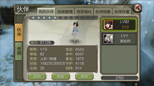 橙色:群獸怒吼(主人和同伴暴擊率搭檔進步30%,繼續2秒,冷卻30秒)(雪原boss掉)運用「同伴升星丹」可進步同伴星級,星級越高,資質上限越高,星級還能夠被繼承。升星丹能夠商城購買10元寶一個,或許能夠從副本翻牌獲取。記住哈,同伴星級必定要進化到至少4星,然後優先把進犯力這塊加滿,你的戰鬥力就上去了。
