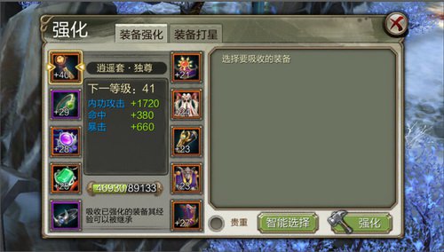 【强化体系】强化体系也能大幅度进步玩家进犯力,强化的来源可所以普通装备,玄铁或许精钢。这儿引荐挂机就设置强化兵器。毕竟兵器是强化加层最高的。