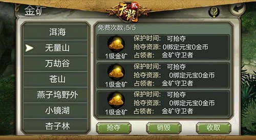 是金子!抢来的才够劲爆!少侠们每天有5次免费争夺金矿的机会,同一时间内最多只能占据一座金矿,在已有占据金矿的状况下去争夺其他金矿会可是会毁掉已占据的金矿哦。